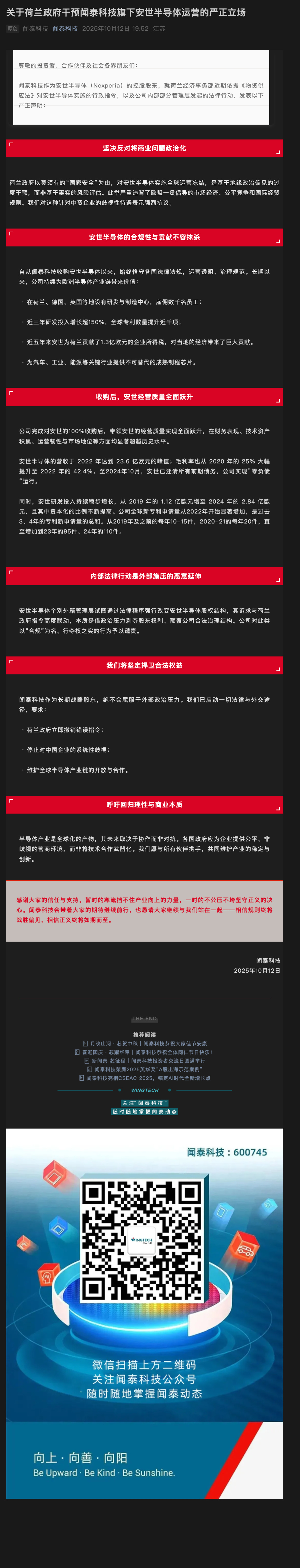 Then, today/Sunday/October 12, 2025, Wingtech dropped a bombshell filing with the Shanghai Stock Exchange.