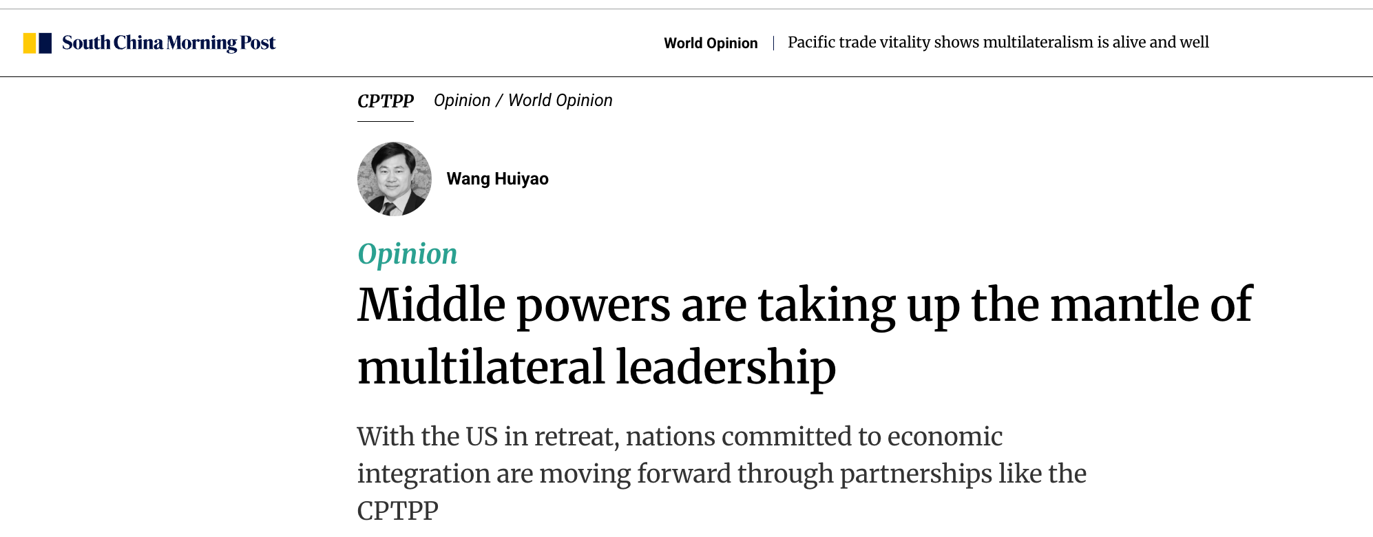 The President of CCG writes in the South China Morning Post that, with the US in retreat, nations committed to economic integration are moving forward through partnerships like the CPTPP