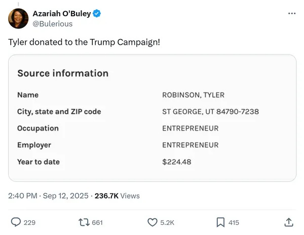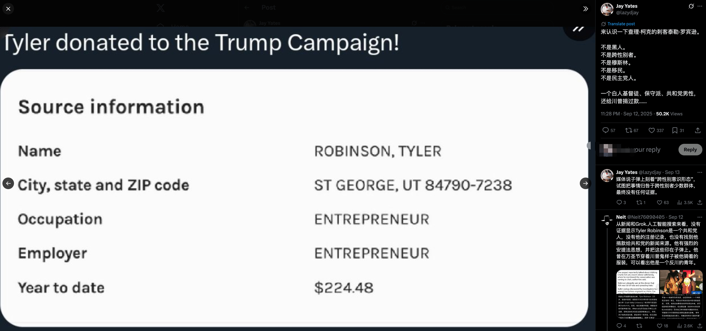 A Sept. 12 X post from a pro-China account claimed suspect Tyler Robinson donated $224 to the Trump campaign in 2020, writing: “Meet Charlie Kirk's assassin Taylor Robinson. Not Black. Not transgender. Not Muslim. Not an immigrant. Not a Democrat. A white Christian, conservative, Republican male, who even donated to Trump.”