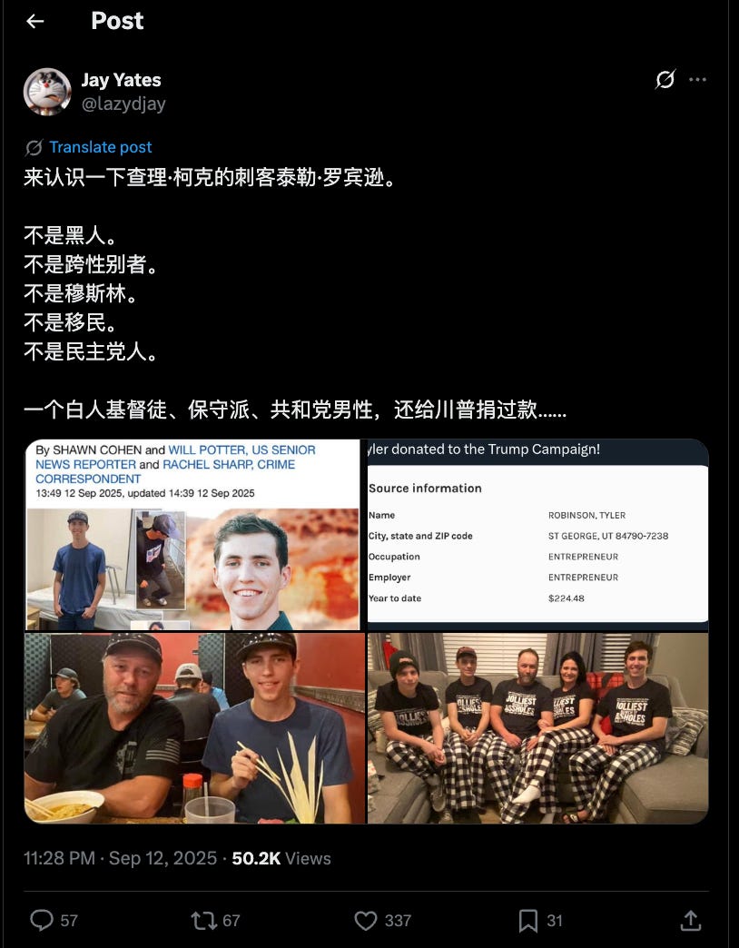 The post in question, after a full week, recorded only 57 comments, 67 retweets, 337 likes, and 50.2k views - clearly not a very influential tweet in a sea of tweets in the aftermath of the despicable assassination of Charlie Kirk.