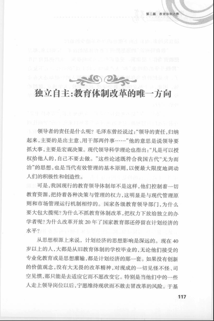 However, our current educational leadership system is not like this. They control all educational resources and monopolize all decision-making and administrative power. This clearly contradicts modern management principles and the operational mechanisms of a market system. Why do national and local educational authorities insist on doing everything themselves? Why not focus on reforming the educational system and delegate power to independent school-runners? Why, after 20 years of reform and opening up, is the Ministry of Education still stuck at the level of the planned economy?