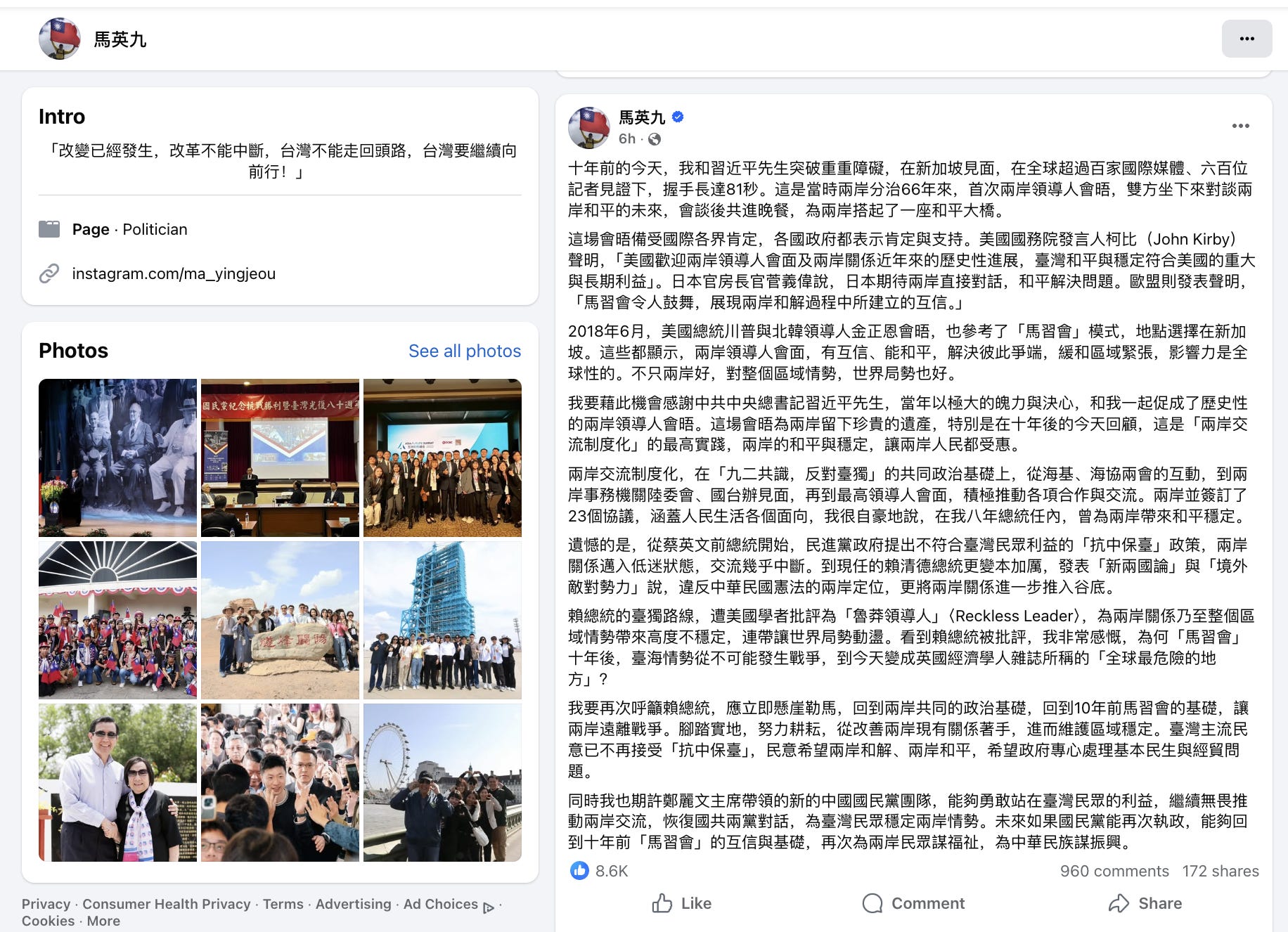Ten years ago today, Mr. Xi Jinping and I overcame numerous obstacles to meet in Singapore. In front of more than one hundred international media outlets and six hundred journalists worldwide, we shook hands for 81 seconds. It was the first meeting between leaders of the two sides across the Taiwan Strait in the 66 years since the division of governance. We sat down to discuss the future of cross-Strait peace, and after the talks we shared a dinner, building a bridge of peace across the Strait.