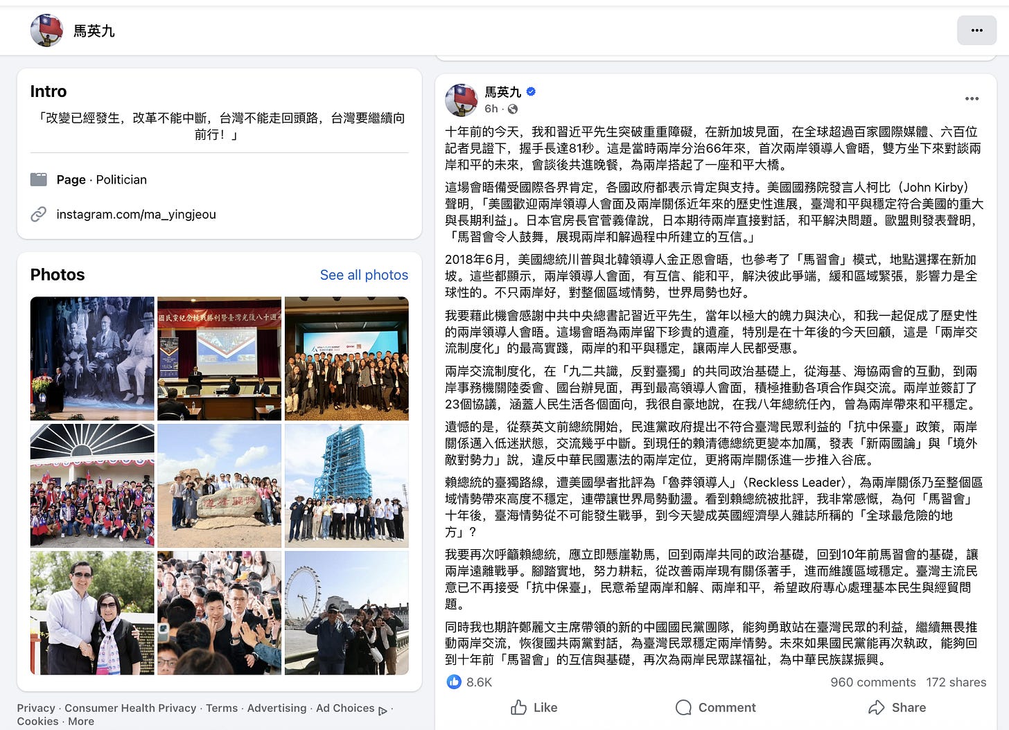 In his Chinese-language account on Meta, Ma wrote today