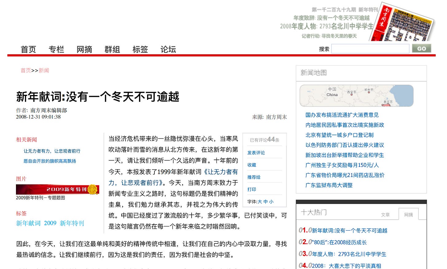 Below is Southern Weekly’s 2009 New Year’s message, published on December 31, 2008, when the newspaper was among China’s most recognizable media outlets.