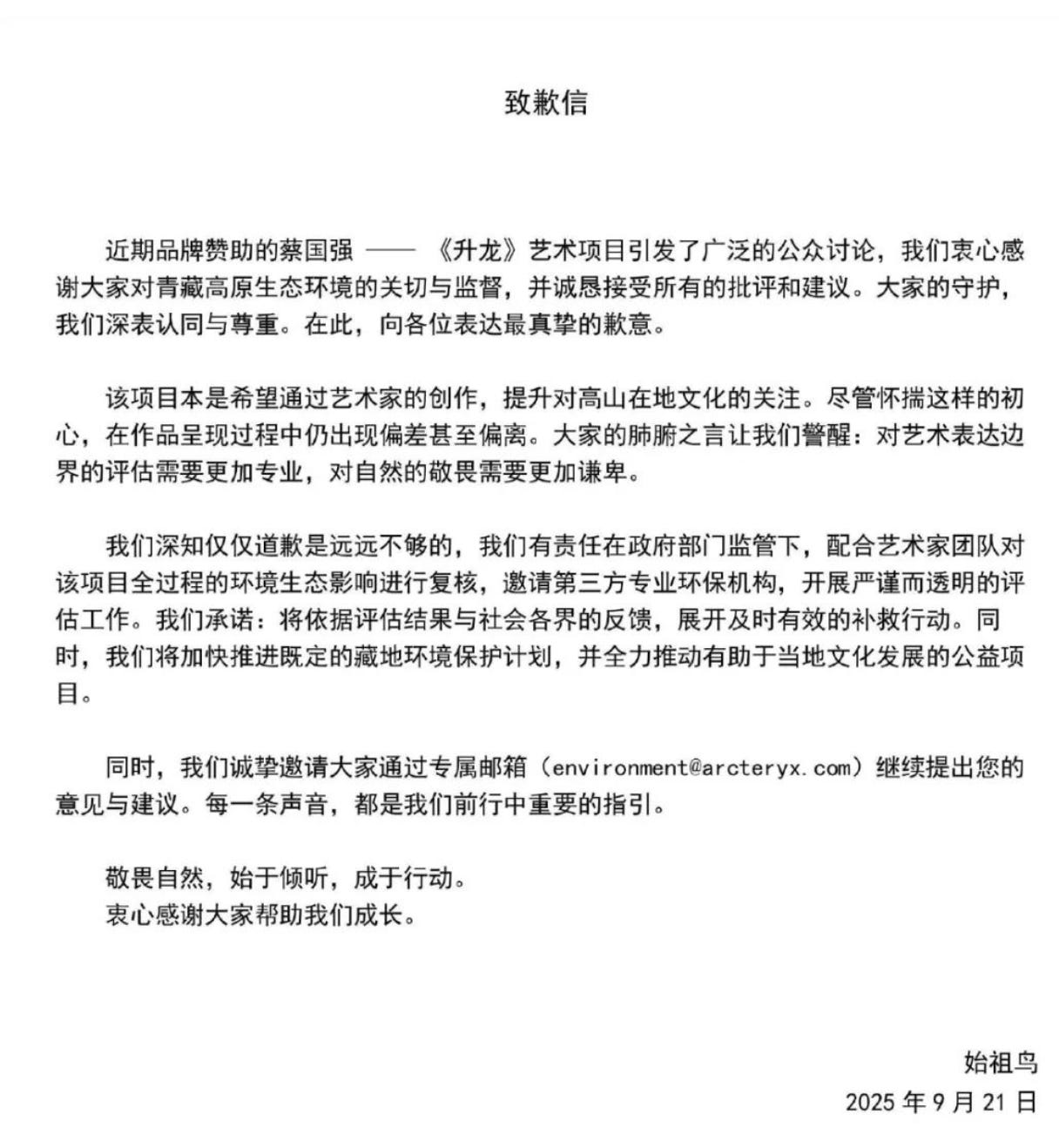 The timeline is damningly brisk. Videos of Cai’s 升龙 “Ascending Dragon” pyrotechnics raced across Chinese platforms on September 20. By the early hours of September 21, the Shigatse authorities announced an investigation and pledged to handle the matter according to law. Arc’teryx and Cai both issued statements of contrition the same day, promising third-party environmental assessments and “remedial action.” Promotional posts vanished. Reverence turned to recklessness in a single news cycle, and the brand discovered the difference between stunt and sin.